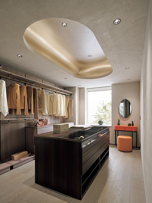 主寝室とは別に設置されたウォークインクローゼット。中央にアイランドカウンターを配し、効率のよい回遊動線に。