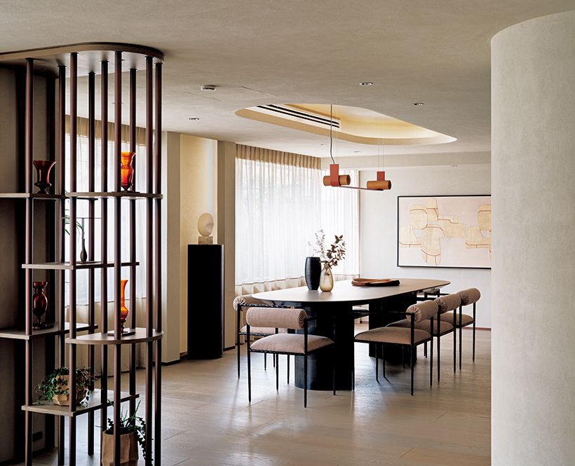 リビングから続くダイニング。続き間を緩やかに分けるのは、造作のシェルフと折り上げ天井。ダイニングテーブル奥の壁に飾っているのは、ハイエンドなフランスのインテリアブランド「エリティス」の壁紙。抽象的な意匠が、空間と見事に調和する。