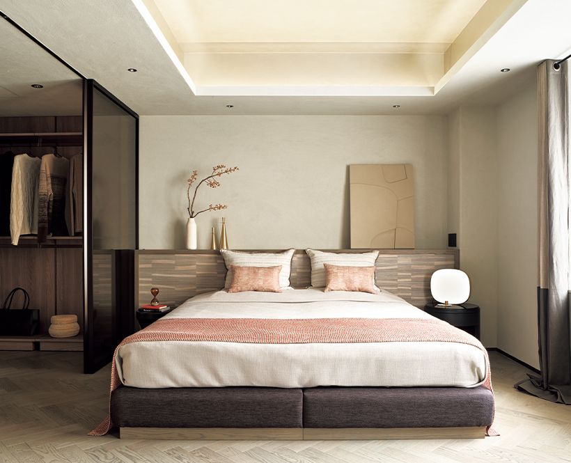 主寝室の壁と天井もほかの部屋同様、左官仕上げの土壁を採用。濃色ガラスを用いたウォークインクローゼットは、引き戸を閉めても内部がほのかに透けて見え、ショーケースのような佇まい。