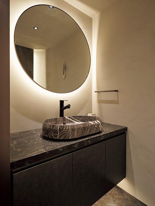 洗面所は石と土の素材感を生かしたしつらい。静かな余白が、日常の所作さえも美しく引き立てる。