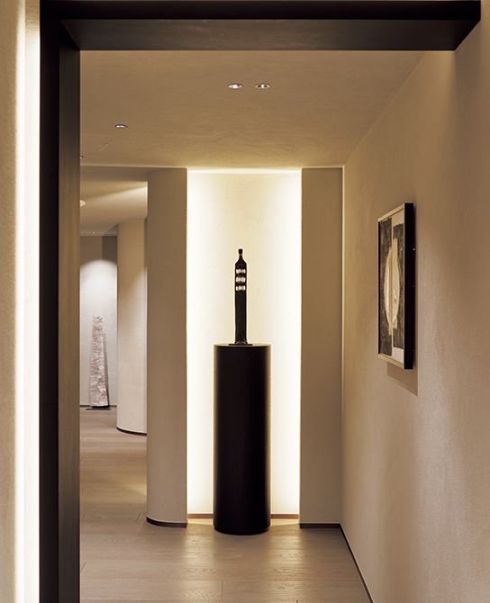 余白と間を生かすスケルトンリフォームでも取り外せない耐力壁を生かし、エントランスホールへと続く壁面をアートギャラリーに。その中心を飾るのは、世界的彫刻家・豊福知徳さんの作品。周囲に意識的に余白と間を設けることで、通路をアートと向き合う場へと昇華しています。「選び抜かれたアートピースが住まいに命を吹き込みます」(コマタさん)。