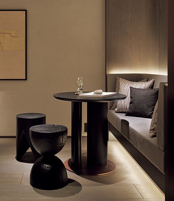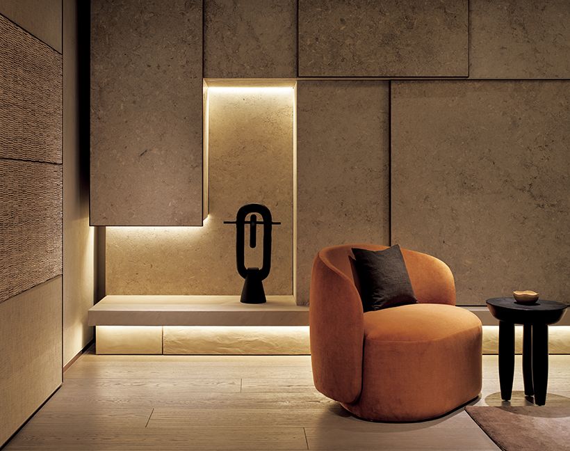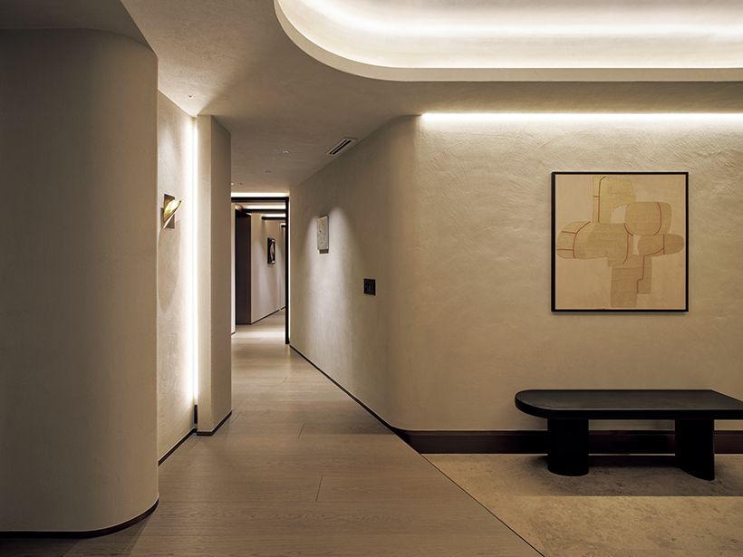 石、漆喰、和紙壁や天井は土や漆喰を用いた左官仕上げ、床は木や石、扉は和紙といった自然素材を基調に構成。既存軀体の凹凸の壁(写真)は、その奥行きの差を生かしながら石壁や収納として取り込みました。過度に主張しない自然の表情が、アートや日常の品々を等しく引き立てる――。それがこの住まいにおけるニュートラルな在り方です。
