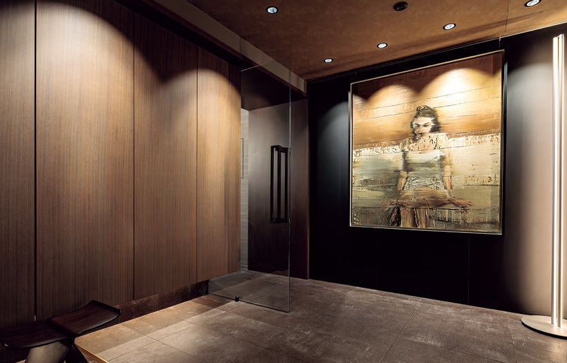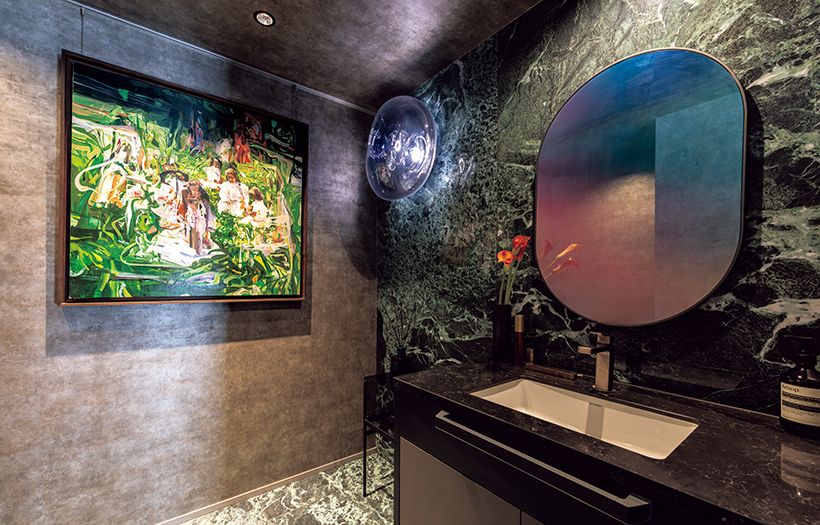 住み手の感性を生かす舞台づくりアートを飾ることを前提とした壁面構成。写真上は上階のトイレ、下はエントランスホールです。「特に玄関はコート掛けや靴箱といった要素を極力排除し、照明の位置や数を吟味して整えることで、作品に迎えられる空間に仕立てました」(各務さん)。現在飾られているのはスイスの画家、アンディ・デンツラーの作品。