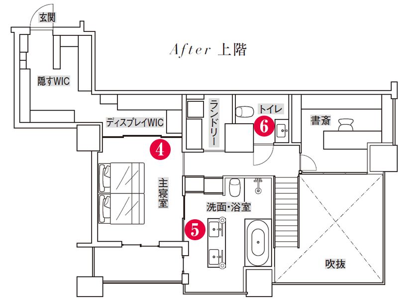 自然光が降り注ぐ配管経路を綿密に調査し、床高を調整して大胆に移設することで実現した、主寝室から繫がる水回り。浴室と洗面台、トイレを一体化し、大きな窓から光を取り込むライトボックスのような構成にしています。「浴槽脇の窓からは吹き抜け越しに眺望が広がり、上階ならではの開放感を満喫できます」(田口さん)。