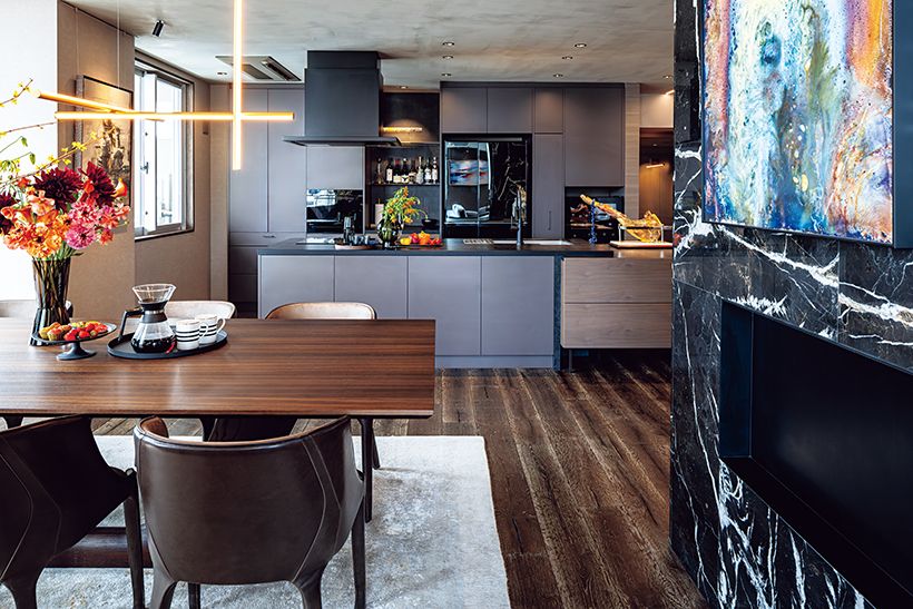 家族が集うリビングダイニングと一体となったオープンキッチンは、「クチーナ」のオリジナル。背面にオーブンとワインセラーを内蔵し、艶を抑えたグレートーンでキッチンらしさを抑制。中央のガラス棚に並ぶボトルが、集いの楽しさを物語ります。ダイニングはテーブル、椅子ともに「アルケティポ」(イタリア)で揃えています。