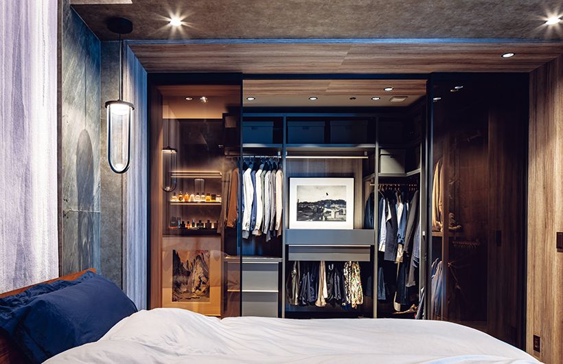 飾るように収納するプライベート空間である上階の主寝室も、閉じた個室にはせず、連続性と透過性を意識しています。ベッド脇には木製門型フレームで縁取られた奥に、ガラス扉で開閉できる「ポリフォーム」のウォークインクローゼットを設置。手前はディスプレイ収納、奥には畳んでしまえる日常着を収め、見せる収納と隠す収納を両立させています。