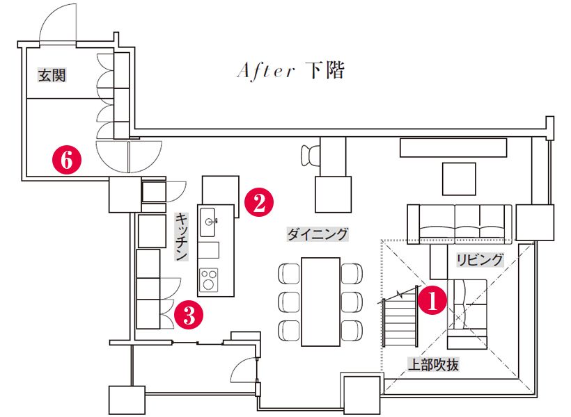 白を基調とした均質な箱から、奥行きを備えた立体的な住まいへ。象徴的なのが大胆に移設した水回りで、排水勾配を確保するため、床高を調整しながら住戸中央の窓際へ再配置しています。CGやVRで改修後の空間を事前に体感し、素材の質感や照明の高さまで細やかに検証。描いた理想を形に落とし込みながら、空間を磨き上げています。(図面作成/ワークプレス)