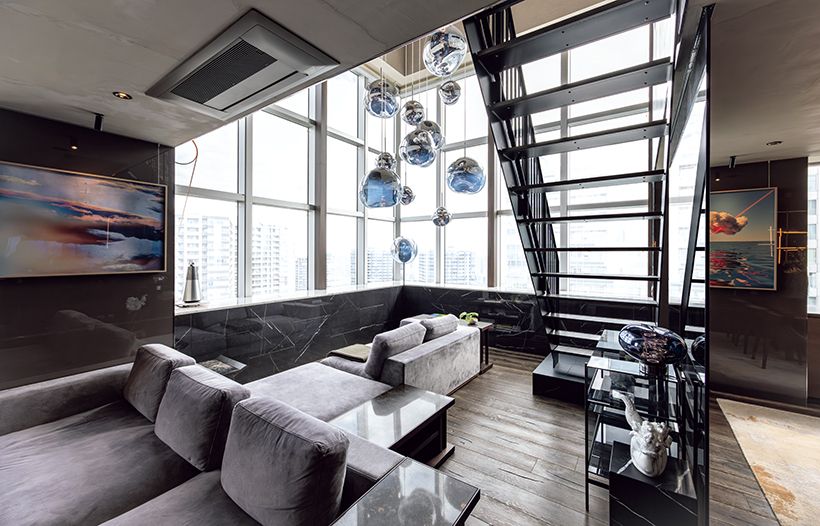 上下に繫がる空間美「トム・ディクソン」の吊り下げ照明が映える吹き抜けは、空間の重心を整える要となる場。既存の鉄骨フレームは生かしながら、手すりと踏み板で透過性を高め、視線の抜けを確保しました。その結果、窓外の眺望と室内に配されたアートが同時に視界に入り、上下階の気配も感じられる構成に。家全体に立体的な広がりが生まれています。