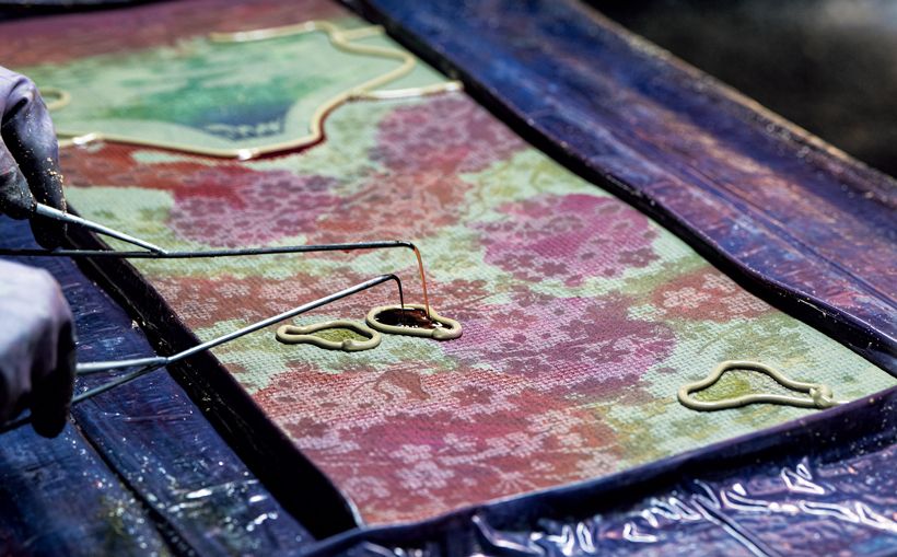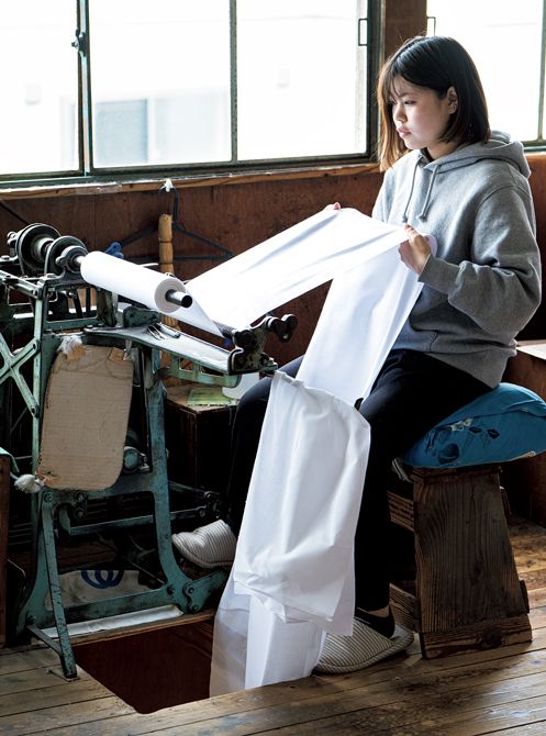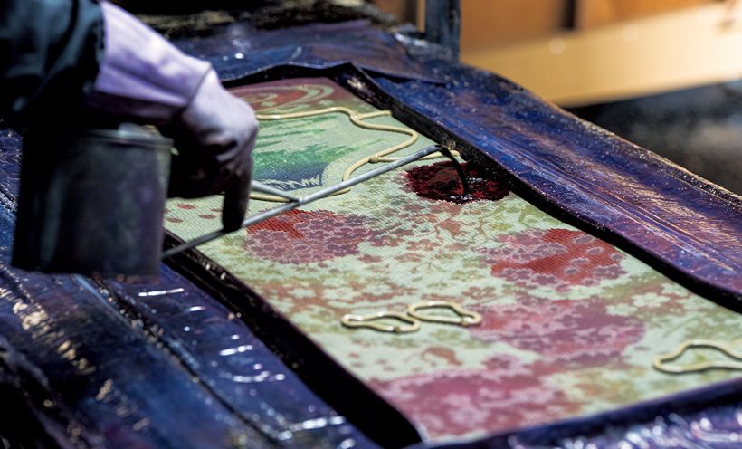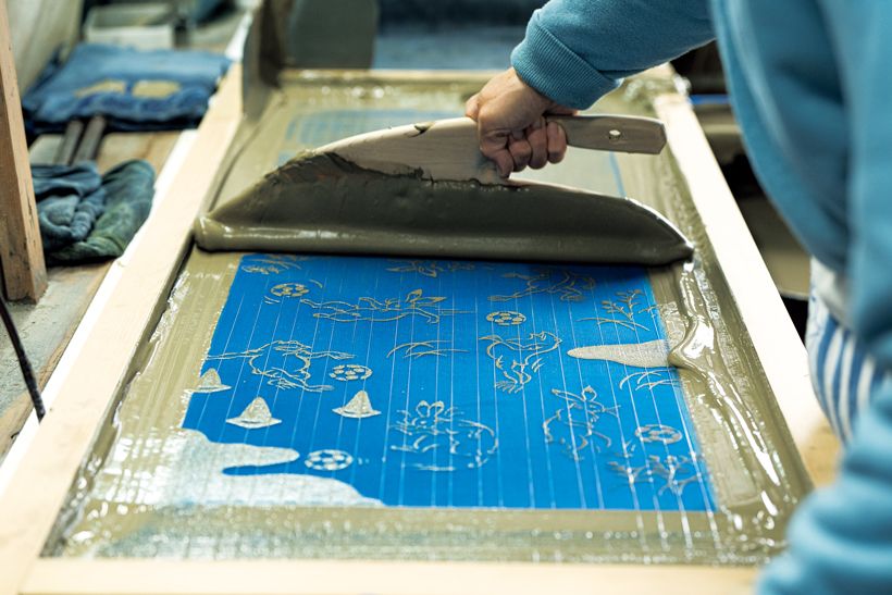 糊付けする「板場」では、その日の気温や柄の細かさに応じて、職人が糊の硬さを毎日調整。最も重要なのは、生地を真っ直ぐに平らに置くこと。さらに、反物を折り返す際に柄が繫がるように置くのは熟練の技術を要します。