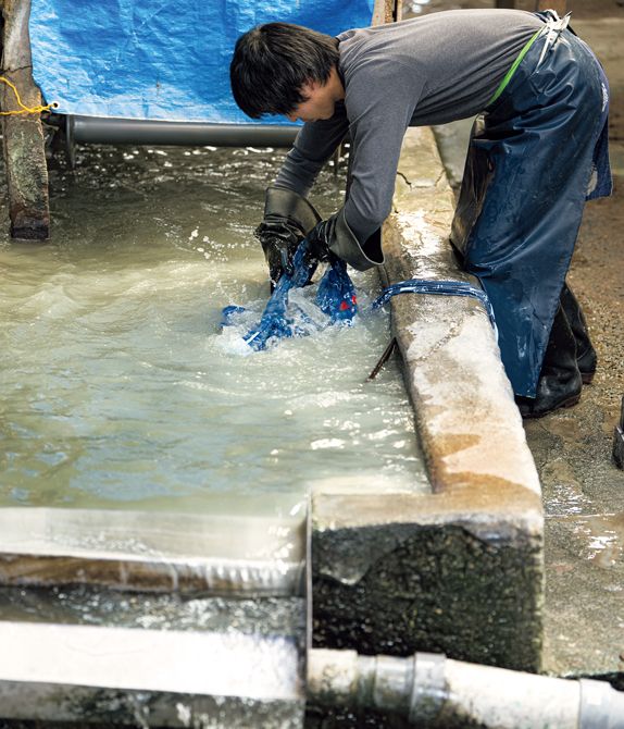染め終わった反物を水洗いし、防染糊を落とします。この工程では水を掛け流しにするため、田川から引き込んだ水をおおいに活用。染めの際に何重にも折り束ねられていた反物を、人の手によって水の中で丹念にほどきます。