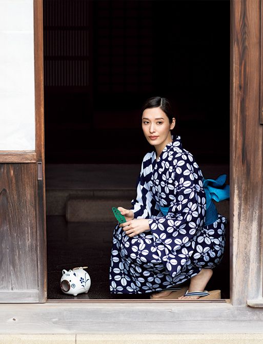 萩の葉が愛らしいコーマ地と、白地に藍の横段を染めた男前な柄の生地を合わせて、片身替わりに仕立てました。丸みのある葉と横段のコントラストで、藍地がより際立ち、すらりと見える効果が生まれます。片身替わりは、2反のゆかた地を半分ずつ使うため、残りの反物を仲よしの友人と分け、横段を上前に仕立て、一緒に着るのも楽しいもの。撮影/浅井佳代子 ヘア/hiro TSUKUI〈Perle Management〉 メイク/三澤公幸〈Perle Management〉 着付け/小田桐はるみ 取材・文/神山典子 ゆかたコーディネート・文/相澤慶子