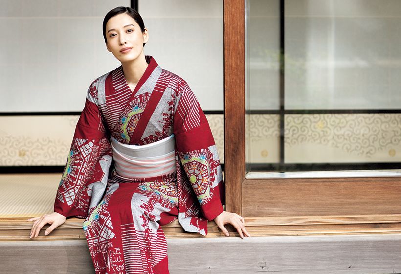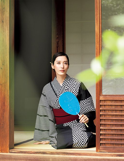 「JUNKO KOSHINO」のゆかたは、着る人が涼しく手入れしやすいようにと、セオαという新素材で作られています。重ね菱とよろけ縞の洒脱なデザインの間に、黒の無地の部分を作ることで、すらりとした着姿に。撮影/浅井佳代子 ヘア/hiro TSUKUI〈Perle Management〉 メイク/三澤公幸〈Perle Management〉 着付け/小田桐はるみ 取材・文/神山典子 ゆかたコーディネート・文/相澤慶子