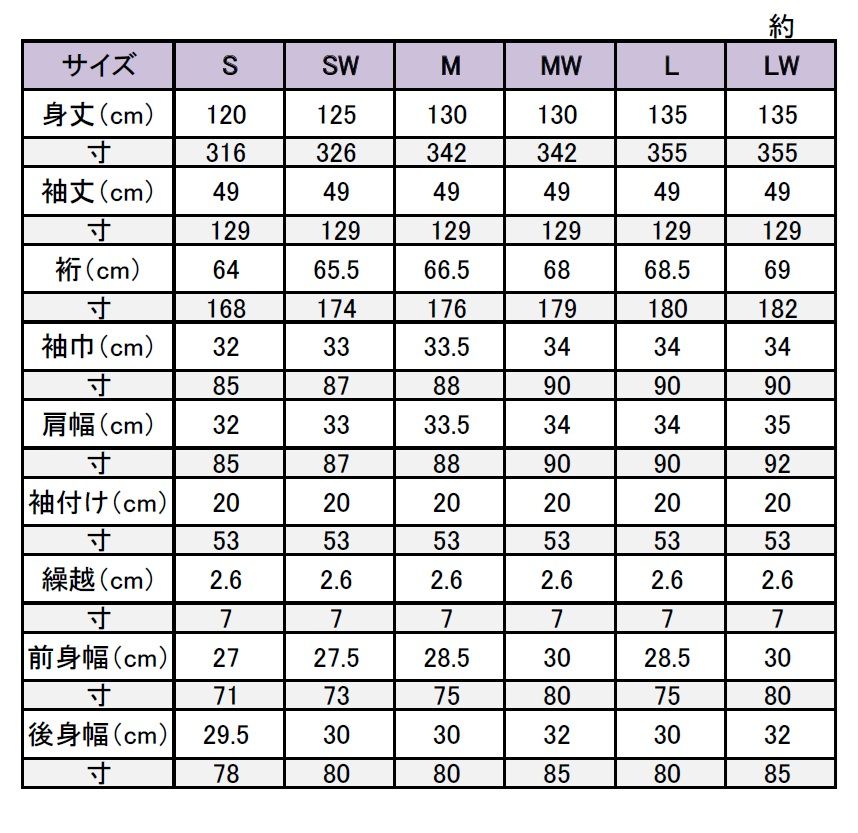 ●材質 本体/東レ爽竹(ポリエステル75%、竹レーヨン25%) 半衿・本体/ポリエステル100% ※ファスナー部分除く 芯地/ポリエステル65%、綿35% ●サイズ S、SW、M、MW、L、LWの6サイズ展開。※詳細は下図を参照ください。 ●日本製 ●お届けまでの目安:ご注文から2か月ほど(受注生産。縫製工場の混み具合により変動することがございます)