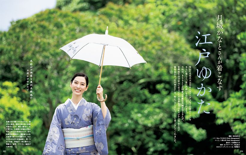 きりりとした印象が素敵な月城かなとさんが、松煙染や自分好みに仕立てた片身替わりのオリジナルゆかたなど個性溢れる“江戸ゆかた”を、粋に、そしてしっとりと着こなしてくれました。
