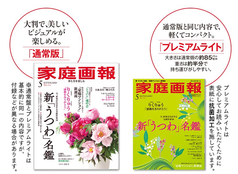 『家庭画報』本誌は、ライフスタイルに合わせて2種類のサイズ(通常版/プレミアムライト版)からお選びいただけます