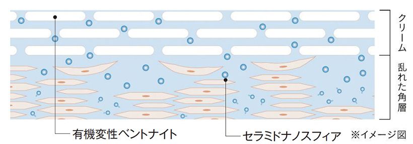 板状ミネラル粉体の有機変性ベントナイトと微細カプセルのセラミドナノスフィアが角層の隙間に入り、潤いで満たします。