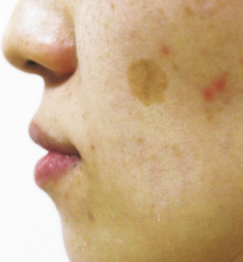 アザの一種で褐色から灰褐色、紫褐色や青みがかった色素斑が頰の両側を中心に出現。