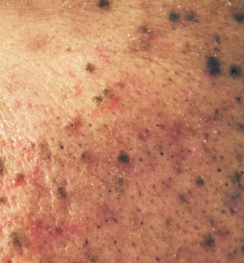 イボのような、皮膚が茶色や黒色っぽく盛り上がった状態。加齢に伴う肌老化によるもの。