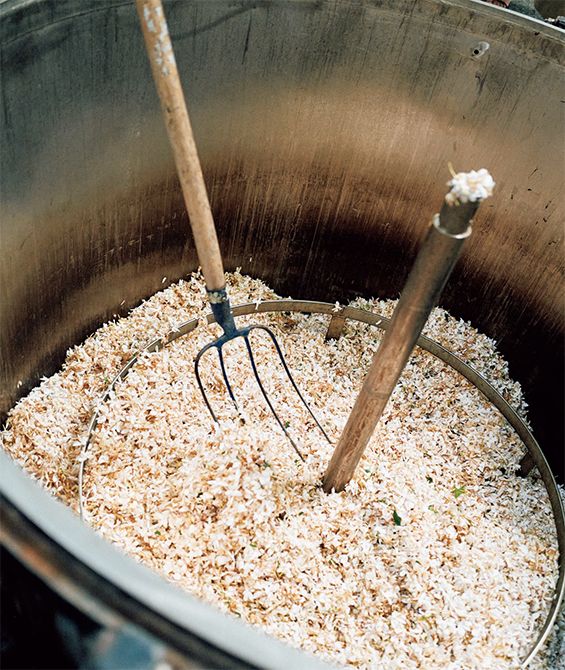 ミュル家と手を携えると同時に、シャネルは農園の敷地内に工場を設けました。それは、収穫されたばかりの花の新鮮なクオリティをそのままに次なる生産工程へと繫げるため。花々は工場へ運ばれ、フレグランスづくりに使える原料へと姿を変えていきます。まず、花を溶剤に浸して液体を取り出す作業を繰り返すこと3回。