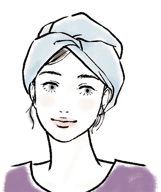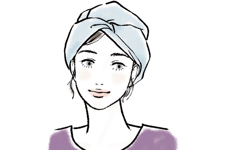 (1)髪の水分はタオルターバンに吸水させて洗髪後の髪をそのままにしておくと、場所によって乾き方にむらができたり生乾きになることが。タオルをすっぽりと巻き、まんべんなく髪の水分をタオルへ移します。