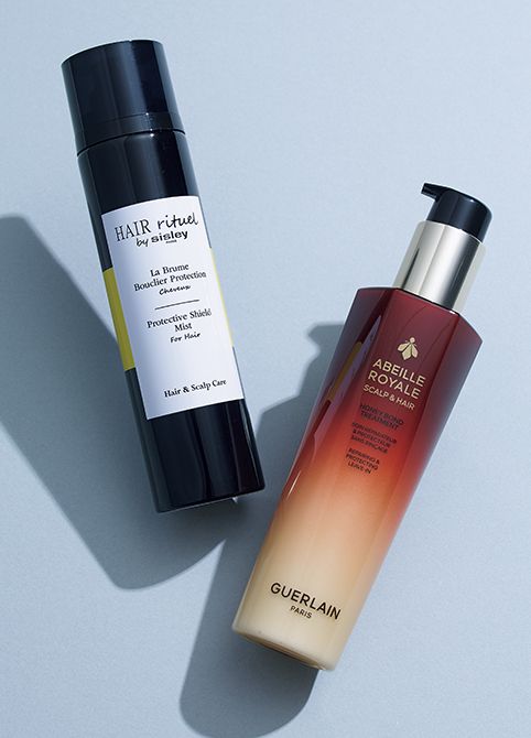 無防備な髪はアウトバスアイテムで守りましょう。右・ドライヤー前になじませて。アベイユ ロイヤル スカルプ&へアH ボンド トリートメント 150ml 1万2540円/ゲラン 左・紫外線や乾燥、湿気など外部刺激から髪をシールド。お出かけ前に。へア リチュアル プロテクティブ シールド ミスト 100ml 1万3750円/シスレー