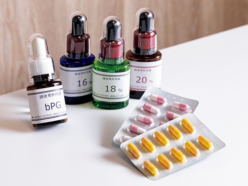 「薄毛の状態は人それぞれなので、まずは外用薬の処方からスタート。当院は、院内処方で外用薬の濃度を6〜20パーセントまでご用意しています。内服薬を併用することもありますし、血液検査の結果によっては鉄などの栄養剤を処方することも」。