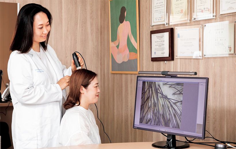 初診時はマイクロスコープを使って頭部を撮影。頭皮と髪の状態をチェックするのが治療の第一歩。「1つの毛穴から複数の髪が生えているのが正常な状態です。毛穴1つ当たりに生える髪の本数や太さ・長さの状態などを見ています」。
