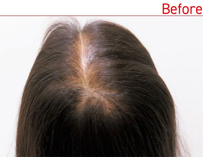 施術前は髪の分け目から頭皮が透けている。髪の量が少なく、全体的にボリュームが出ないほかに、頭皮のベタつきや、他人の視線が気になるといったお悩みも。