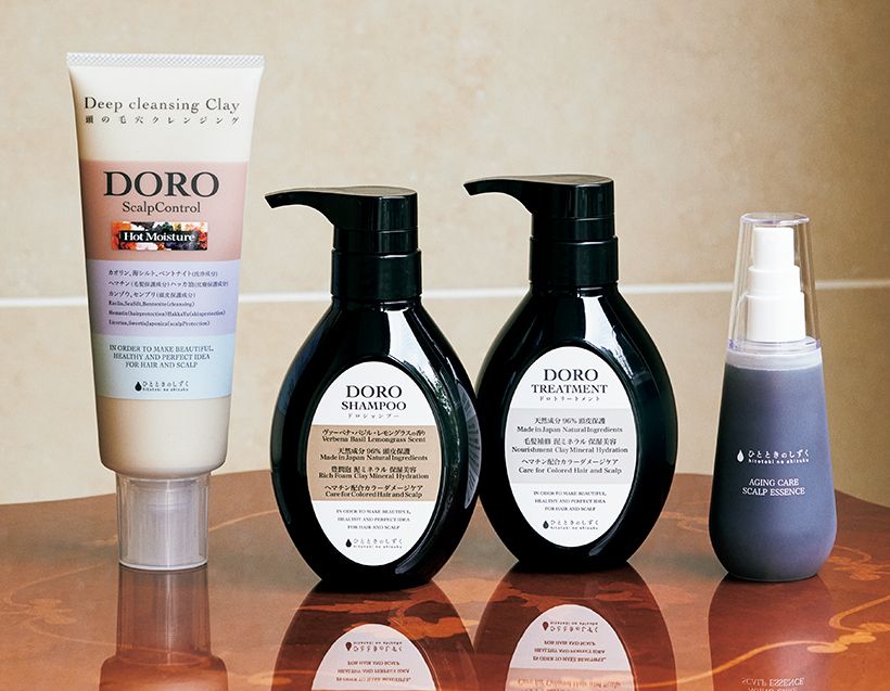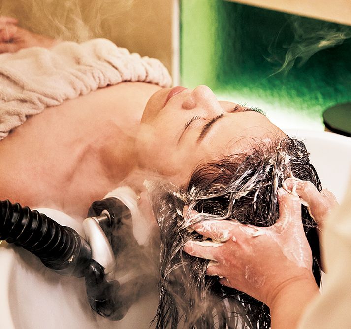 サロンオリジナルの頭皮クレンジングを使った「DORO マッサージ」。泥の力で頭皮の皮脂や汚れをすっきり取り去る。