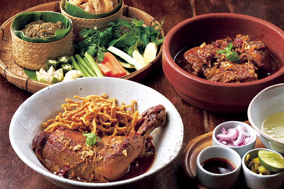 手前から、カオソーイガイ260バーツ、5時間煮込んだ豚肩肉のカレー煮込み390バーツ、生野菜や豚皮の揚げ物が添えられた青唐辛子のディップ、ナムプリックヌム190バーツ。