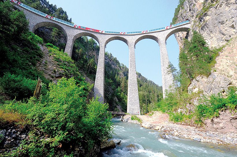ランドヴァッサー橋を渡る氷河特急。世界遺産「アルブラ線」のシンボルだ。撮影/櫻井 寛