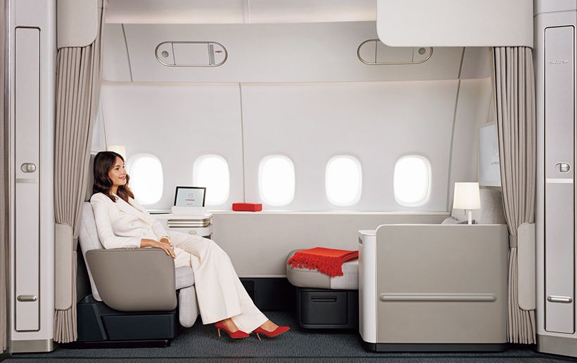 機窓5つ分の長さを誇る新スイートは、約3.5平方メートルの広さを確保。アームチェアと、長さ2メートルのベッドに展開するシェーズ・ロングを備えています。天井から床まで厚手のカーテンで仕切られた座席は、まるでホテルのスイートルームのようなプライベートな空間を演出。