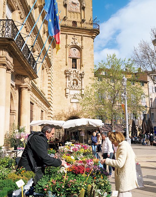 セザンヌが妻・オルタンスと結婚式を挙げた、エクス・アン・プロヴァンス市庁舎前の広場で火曜・木曜・土曜に開かれる花市。石造建物の黄色い壁、青空、緑の街路樹が織りなす光景は、セザンヌが愛した故郷の色彩そのもの。彼が見つめ続けた日常の美しさを、私たちも現実に体験できる場所。