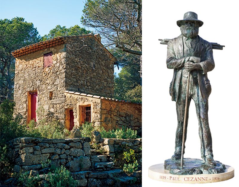 左・ビベムス採石場にあるセザンヌの山小屋。右・ロトンド広場にあるセザンヌ像。