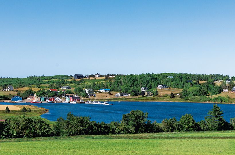 島の象徴的な景勝地、フレンチ・リバー。島には多くの漁村があり、フレンチー・リバーは北部に位置する小さな漁村。青い水面の入り江には、カラフルな小屋や漁船が並んでいる。右の地図・カナダの東側に浮かぶ、面積約5660平方キロの小さな島、プリンス・エドワード島。先住民族のミックマック族は、その弧を描いた細長い形から「アベグウェイト=波間に浮かぶゆりかご」と呼んでいたという。