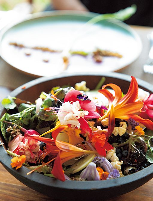 野菜やハーブ、花が盛り合わされたサラダは、土の上で採れた野菜の「ハーベスト・ボウル」(手前)と、土の下で採れた野菜のピュレが添えられた「アース・プレート」(奥)の2皿。
