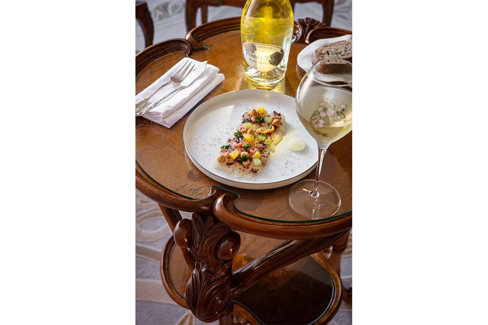 パースニップのピュレ、海藻、ヘーゼルナッツをのせた柑橘香るすずきのカルパッチョに、シャルドネ100%による「ブラン・ド・ブラン(Blanc de Blancs)」が優雅に寄り添う。その精緻な酸と透明感が食材を引き立て、完成度を高めている。