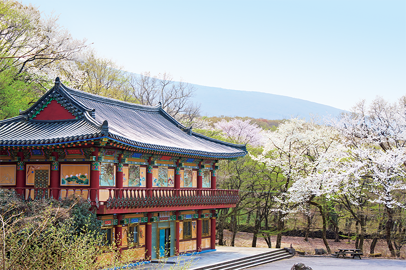 漢拏山(ハルラサン)の中腹に位置する観音寺。森の中にたたずむのは、伝統的な彩画技法「丹青(タンチョン)」(赤・青・黄・白・黒)で彩られた、色鮮やかな伽藍。桜とのコントラストが見事です。