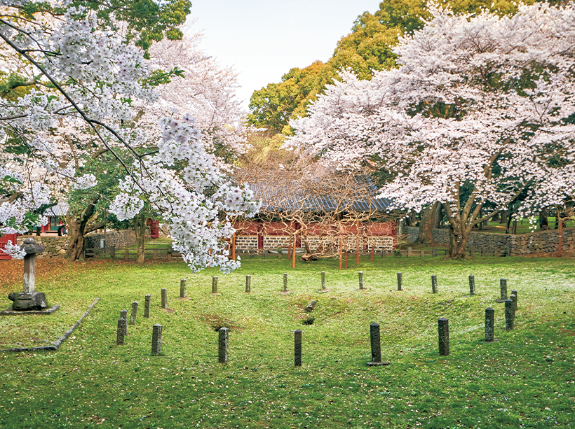 1849年創建とされる「祟報堂」(スンボダン)と桜。敷地内では済州島の古代史を解説するパネルやアニメーションの上映も。