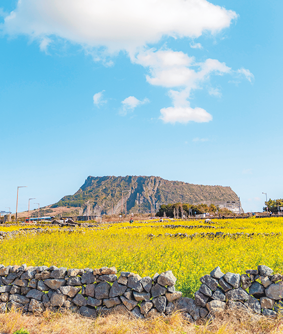 約180 万年前の噴火で形成された標高1950メートルの漢拏山と、島全体に300以上点在する高さ数百メートルの円錐形の丘「オルム(側火山)」は、玄武岩(黒い火山岩)の石垣とともに、火山島ならではの風景となっています。「済州火山島と溶岩洞窟群」は、2007年に韓国初のユネスコ世界自然遺産に登録されました。こうした自然に触れる島内一周のウォーキングコース「済州オルレ」の道標として、オレンジと青のリボンが結ばれています。