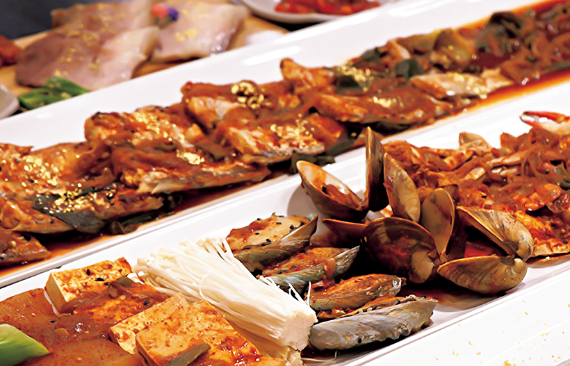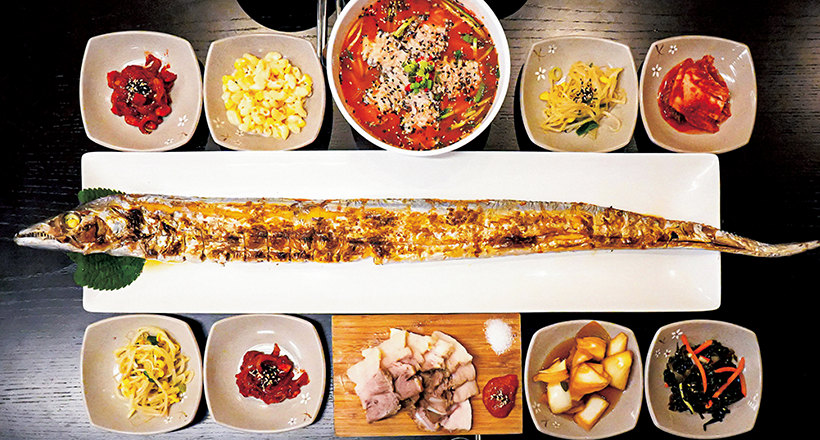 太刀魚は、済州島の食卓には欠かせない食材。ここでは地元産を毎朝仕入れています。丁寧に下処理して細かい骨を取り除いた肉厚で柔らかい太刀魚を甘辛く煮た「太刀魚の煮つけ」は、まさに“ご飯泥棒”。目の前で一気に焼き上げるファイヤーショーが見られる「太刀魚の丸焼き」も、ぜひ注文したい逸品です。