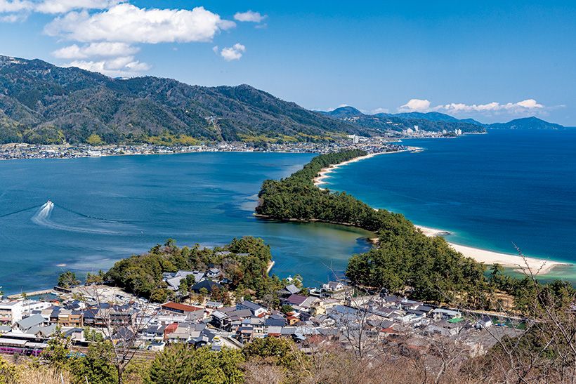 松が茂る全長3.6キロの砂浜からなる天橋立は遠い昔、イザナギノミコトが天界と下界を結ぶために梯子をかけたが、寝ている間に海に倒れて、そのまま陸になったという伝承がある。