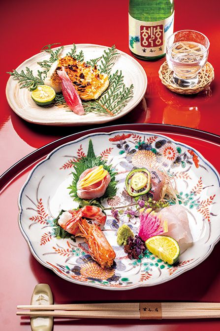 手前は、刺し身4種(車えび、めばる、赤穂鯛、あじ)盛り。奥はぐじの松笠焼き。