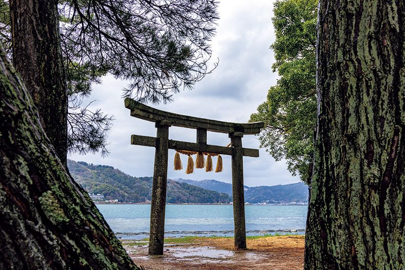 阿蘇海の際に立つ、天橋立神社の鳥居。海に囲まれているが、真水が湧き出る「磯清水(いそしみず)」がある。