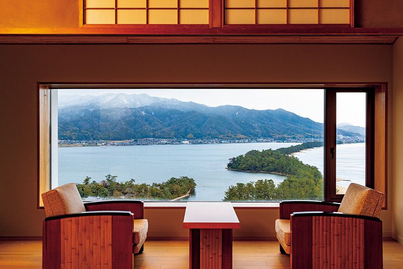 標高80メートルの高台に建つ老舗の宿で、日本を代表する特別名勝の天橋立を客室や露天風呂から、何一つ遮るものなく、独り占めするように見渡せる最高のロケーションにあります。