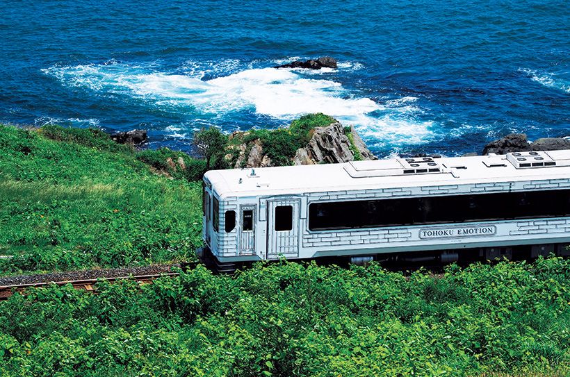 流れる景色の中、絶景に出合えるのも列車の魅力。「TOHOKU EMOTION」が走り抜ける青森・種差(たねさし)海岸では、芝生の濃い緑と紺碧の海の輝きが目に眩しい。