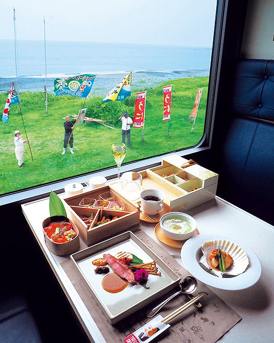 往路のランチメニューの一例。2025年9月までは福島県いわき市の「HAGI萩フランス料理店」 の萩 春朋シェフが監修。途中、岩手・洋野町の地元の方々が列車を見送ってくれる「洋野エモーション」も。復路のデザートビュッフェは3か月ごとに一新される。