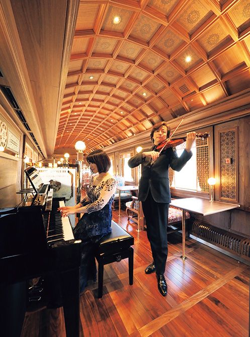 水戸岡鋭治氏が内装を手がけた5号車「ダイニングカー」では、音楽演出家大迫淳英氏によるヴァイオリンとピアノの生演奏が楽しめる。