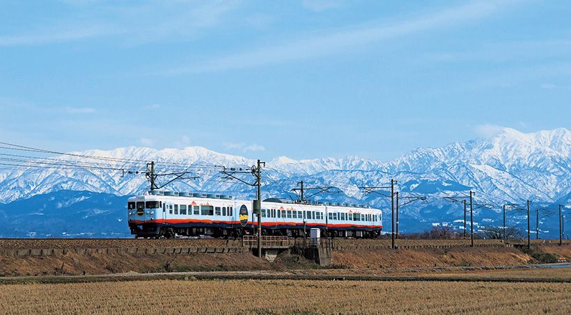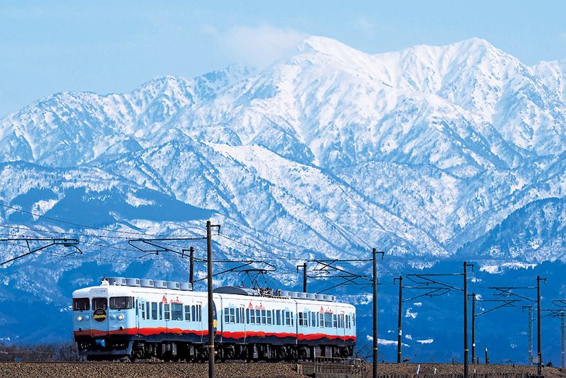 山の絶景標高3000メートル級の山々が連なる立山連峰の美しい姿を背景に走る観光列車「一万三千尺物語」。その名前は立山連峰と富山湾の海底の高低差に由来する。春まで雪景色を楽しめる。