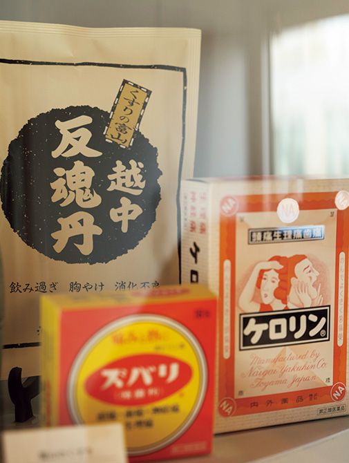 富山といえば思い浮かぶ「薬」。2号車には特産品の陳列棚が。